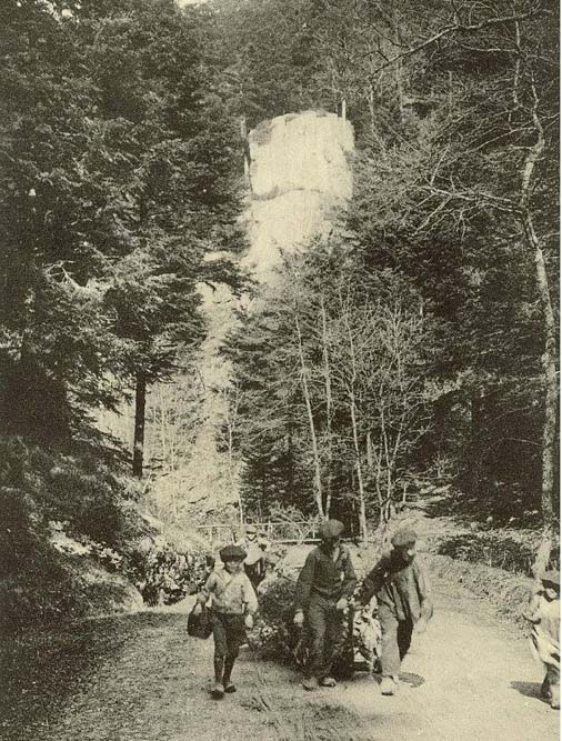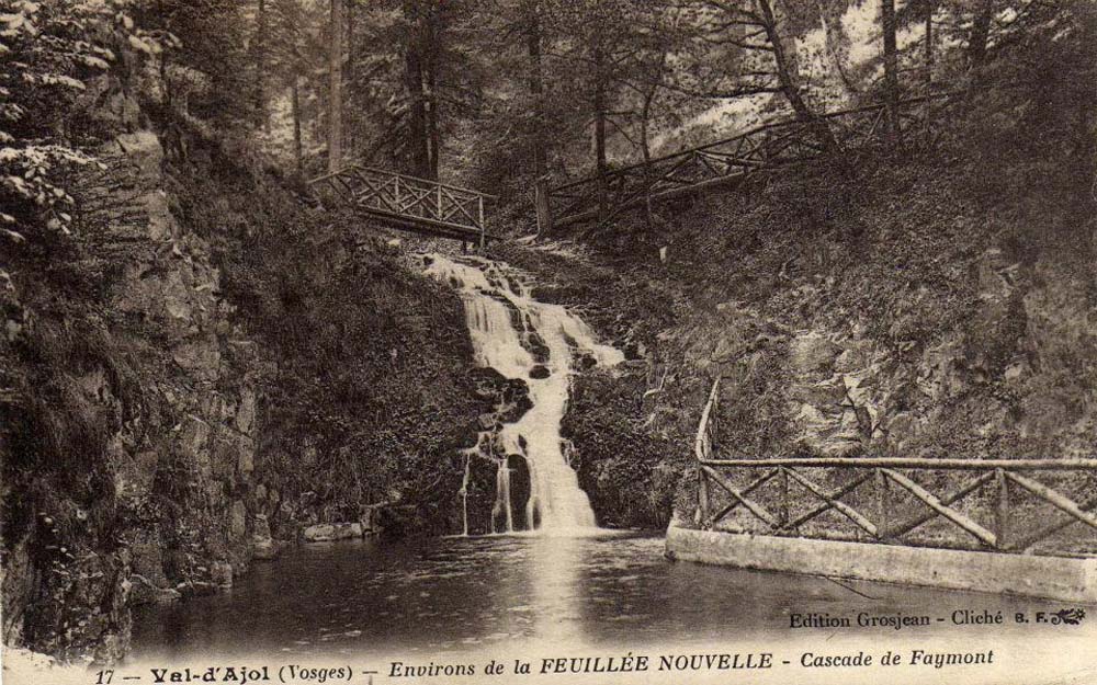 Favorisée par la belle journée de dimanche dernier, la société de gymnastique « la Vosgienne » d’Épinal au nombre de quinze, nous prenons le train de 4 h 50 du matin qui nous conduit à Remiremont, nous traversons la Vallée des Roches et visitons la Cascade du Géhard où nous arrivons à 8 h ½. Chacun de nous se cherche alors une petite place à travers les roches et s’apprête à déjeuner. A 9 heures, après nous être réconfortés, nous reprenons notre chemin par la forêt d’Hérival et arrivons à la Cascade de Faymont vers 10 heures. Malheureusement, la cascade n’a rien d’attrayant pour le moment car par suite de la sécheresse il n’y a presque point d’eau. Nous arrivons ensuite au Val-d’Ajol à 11 heures. Par une chaleur tropicale nous montons à la Feuillée Dorothée.