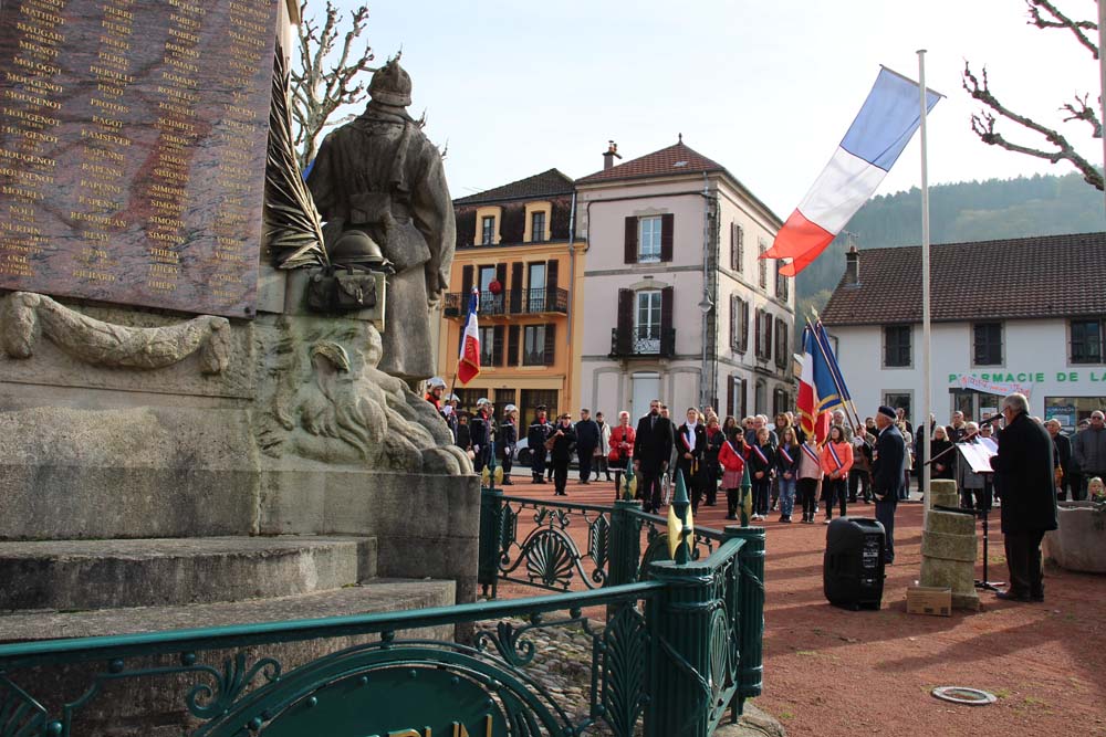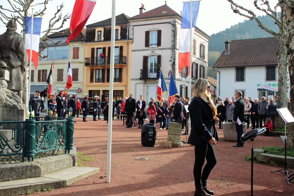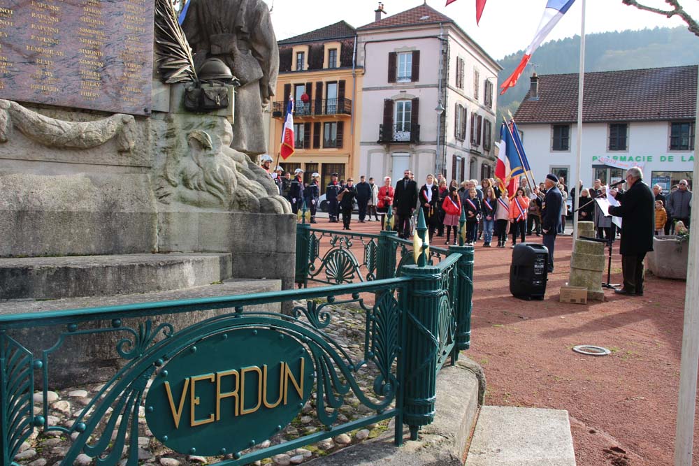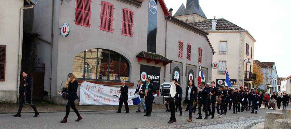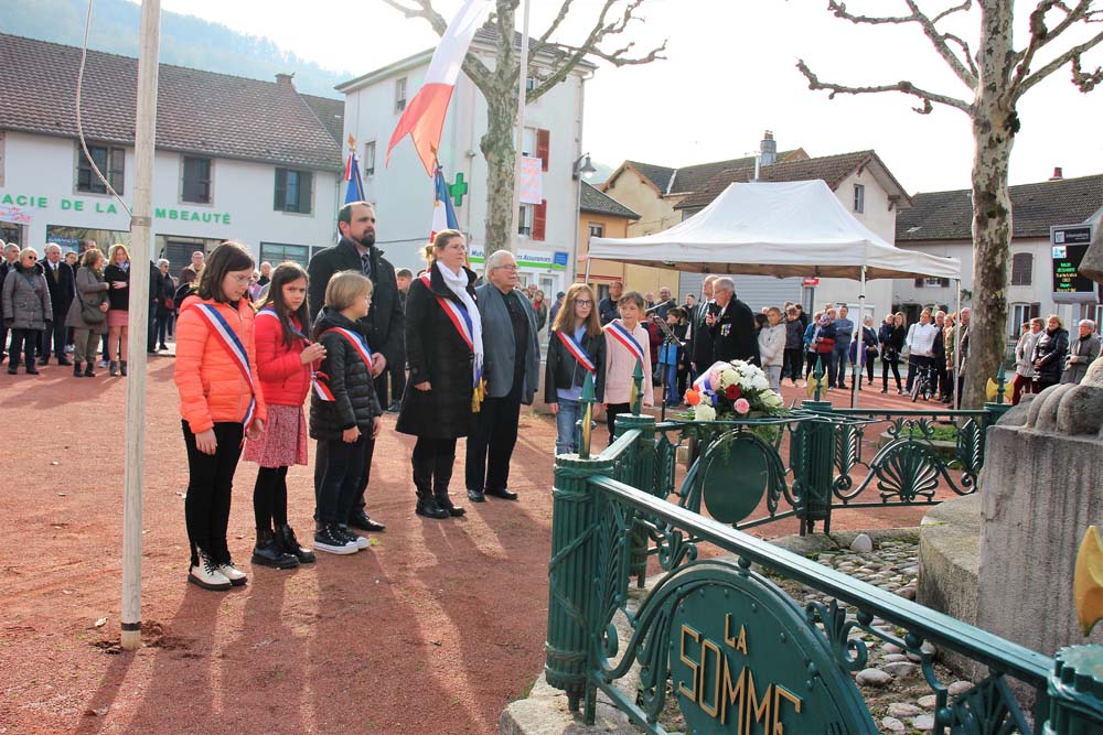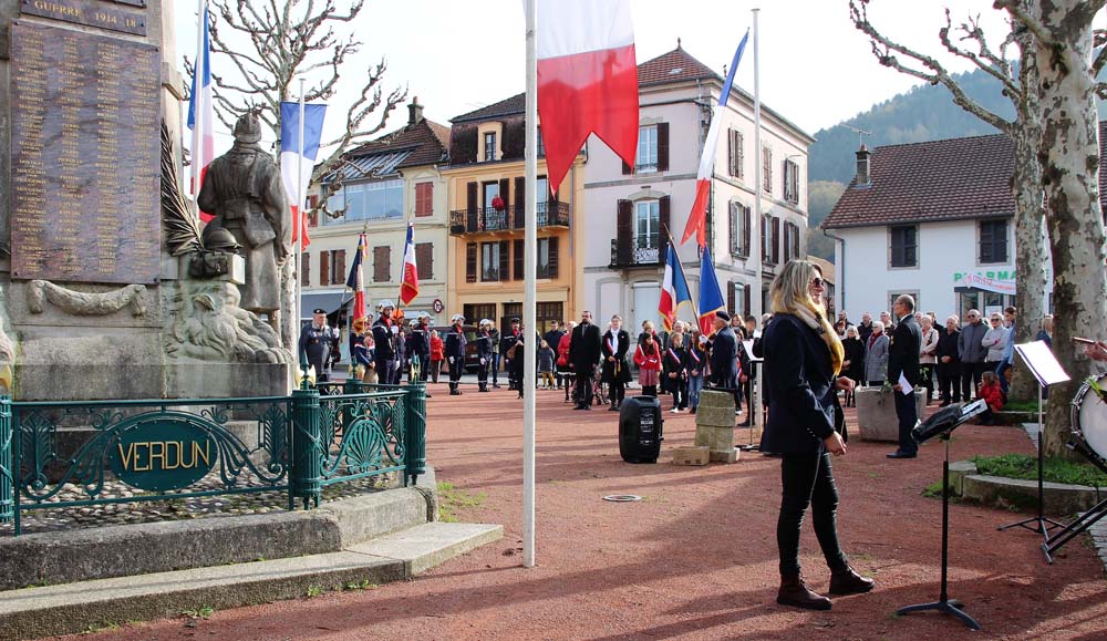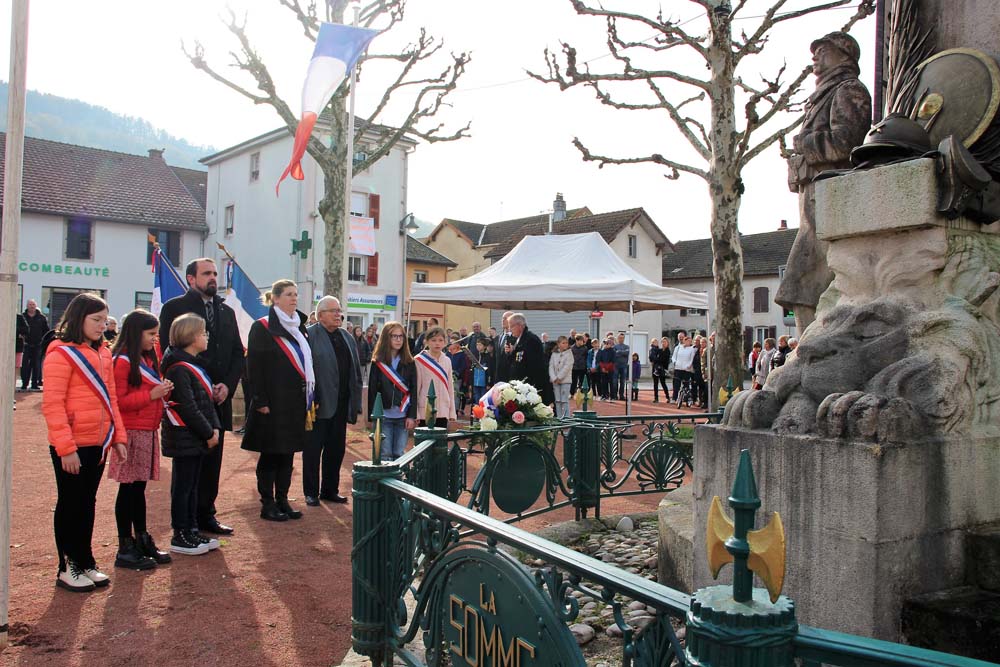 Retour au Monument aux Morts au centre-ville ou la population Ajolaise était présente pour assister à la cérémonie du 104ème anniversaire de l’armistice de la grande guerre. Après les discours officiels et le dépôt de gerbe, les élèves de la classe de M Christophe Colnot de l’École Primaire du Centre, ont chanté le refrain de la Marseillaise, ensuite M Jean-Claude Brignon a relaté la construction du monument qui vient de passer un siècle d’existence.