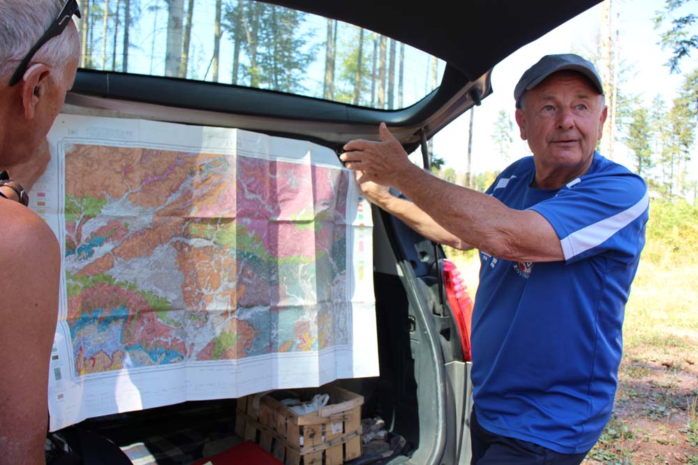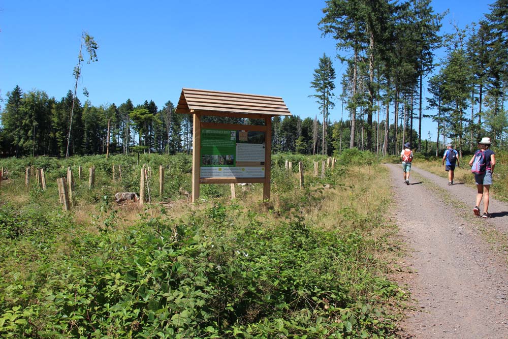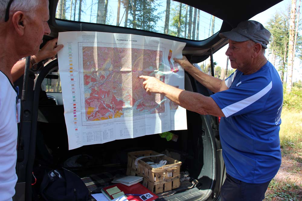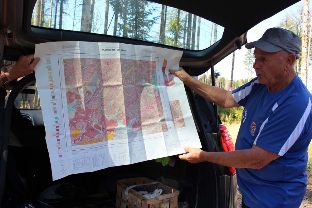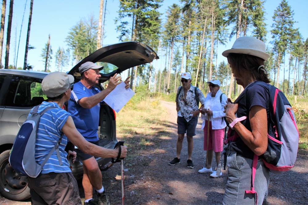 Après ces explications, le groupe traverse la forêt de la Sauce peuplée autrefois de saules, dévastée par le scolyte et repeuplée grâce au mécénat de De Buyer et observe un tas de pierres fruit de l’épierrement des champs. Ces blocs sont des grès à Voltzia, un grès à grains très fins du Trias (240 Ma environ) utilisé autrefois pour tailler des meules et qui contient des fossiles végétaux d’ancêtres de nos conifères. Le plateau dégagé est fouetté par les vents qui peuvent déplacer la neige en hiver et la rejeter plus loin. Aussi, ces amas de neige puis de glace ont façonné le petit cirque glaciaire observé plus tard.