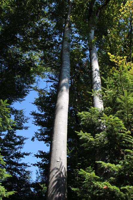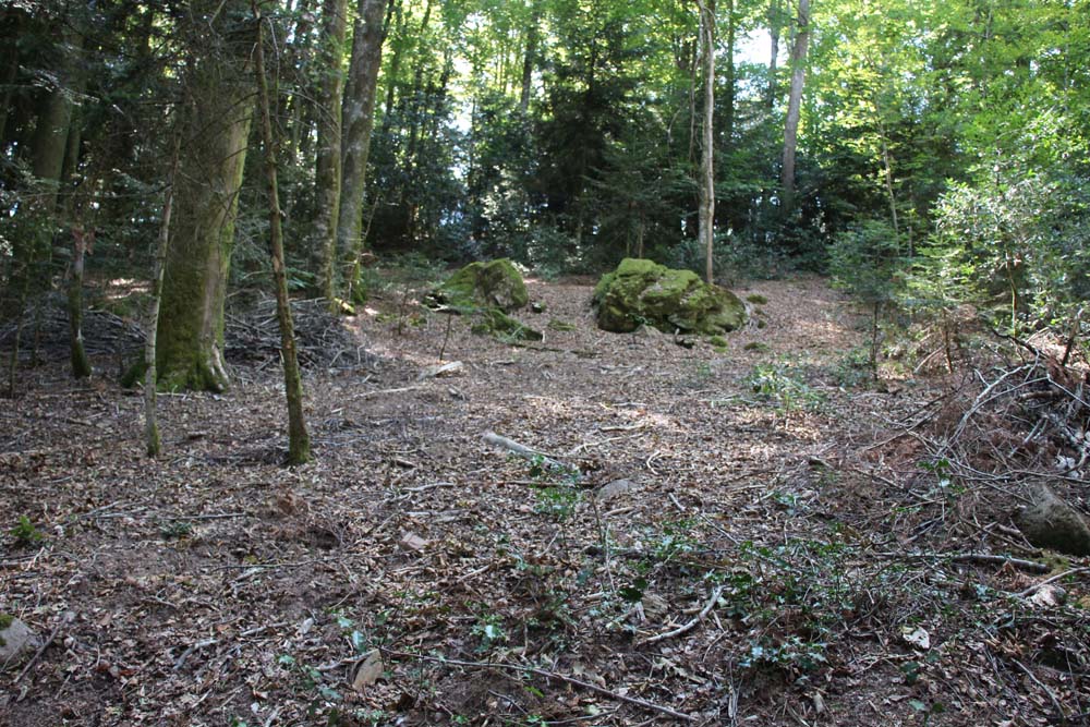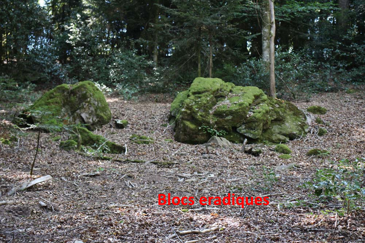 Plus loin, dans la forêt, deux énormes blocs de grès appelés blocs erratiques ont été abandonnés là lors de la déglaciation vers —10.000 ans. Les arêtes de ces pierres appelées moraines sont usées par le frottement lié au transport des blocs par le glacier.