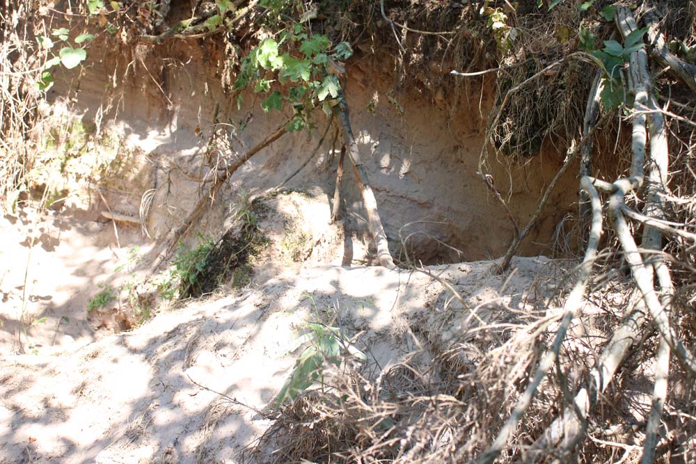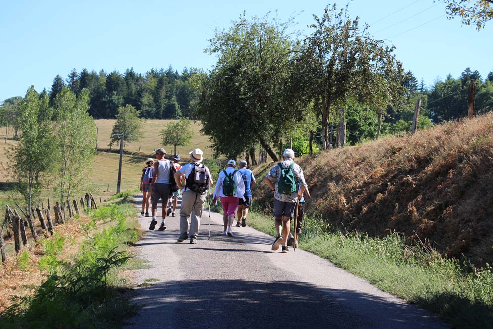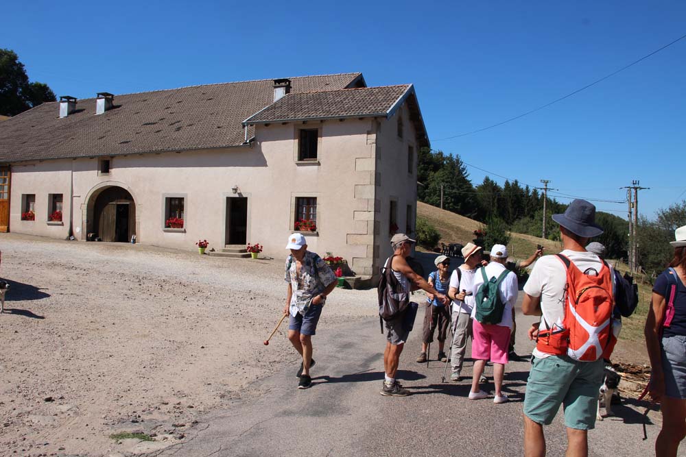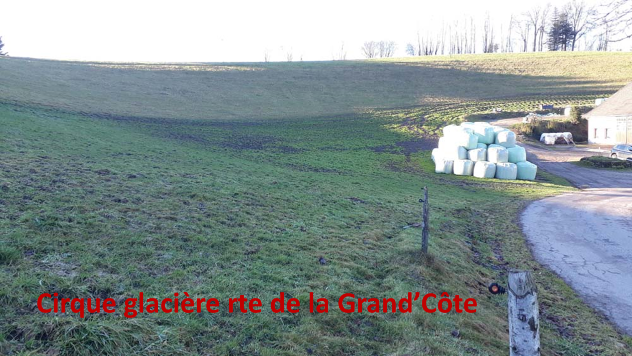 Le groupe contourne la maison au bout du chemin dont un bandeau en latin sur la façade demande une protection divine : « Protège nous Seigneur comme la prunelle des yeux ». Plus loin, un affleurement laisse apparaître des lits de sable déposés là par un bras ou une langue glaciaire qui a modelé le plateau à 570 m d’altitude ainsi que les vallées pendant des dizaines de milliers d’années. L’orientation de ces strates indique le sens d’écoulement du glacier. Cet endroit permet d’admirer le site où s’est installé ce cirque ou théâtre glaciaire aux formes parfaites qui surplombe la ferme.
