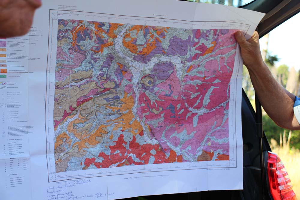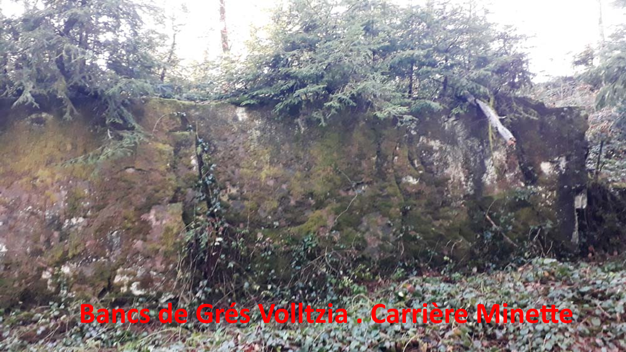 La carrière Minette nous attend maintenant. On y observe les épais bancs gréseux et les minces lits de « laves » qui les surmontent. Ces sables contenant surtout des grains de quartz agglomérés et cimentés par de l’oxyde de fer qui leur donne cette couleur rose ou grise selon la quantité d’oxyde contenue ont été arrachés par l’érosion aux reliefs situés à l’ouest, sur l’actuel Bassin Parisien, au Massif Armoricain et même au Massif Central il y a 240 Millions d’années environ. Ces alluvions ont été charriés par des fleuves gigantesques dessinant des méandres lorsque la pente régionale s’atténuait et que le courant faiblissait sur l’est de la France qui devient ainsi une immense aire d’épandage de particules fines sableuses. Lors d’inondations, de périodes de crues, des végétaux arrachés par le courant sont recouverts puis fossilisés. Ainsi naissent les fossiles végétaux de conifères du grès à Voltzia. Quelques édifices publics de la vallée ont été édifiés avec des pierres de cette carrière. Plus loin , à droite , en bordure de route , se dresse hélas cachée par des fougères une croix de pestiférés du XVIIème siècle sans doute dont une branche du croisillon porte l’étoile de David , symbole de la religion juive , qui indique, pense-t-on, la direction où furent ensevelis les juifs .Le regard porte aussi vers les vallées alignées dans la même direction vers l’est, reste des anciennes failles à l’origine du fossé d’effondrement du Val-d’Ajol dont la profondeur est bien supérieure à la dénivellation actuelle entre les plateaux et le fond de la vallée .