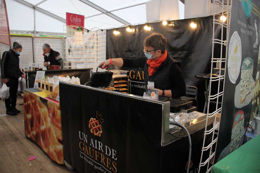 Nouveauté du jour, l’association des parents d’élèves de l’école Ste Marie, proposait des hamburgers à l’andouille, des gaufres salées aux mini lardons, et autres boissons chaudes ou froides, mais aussi des gaufres traditionnelles cuites au feu de bois sur un fourneau à quatre pots.