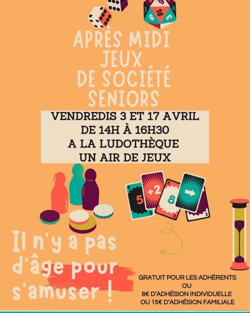 Date 03 04 26 Heure 14 h 00 min - 16 h 30 min Après-midi jeux séniors le 03 avril à la Ludothèque de 14h à 16h30 Partagez cet événement Étiquettes : une