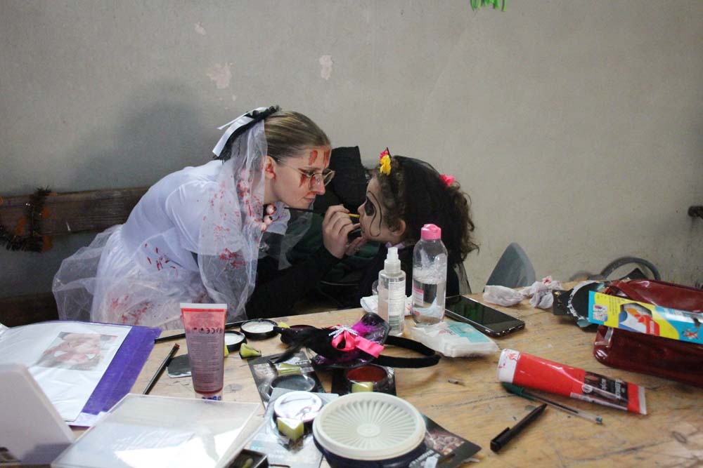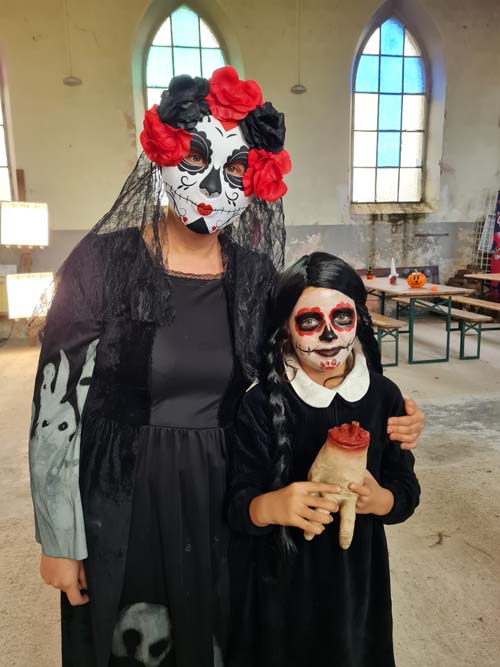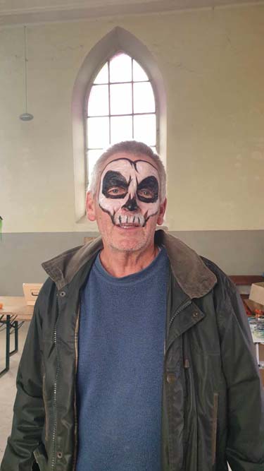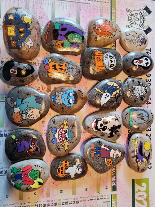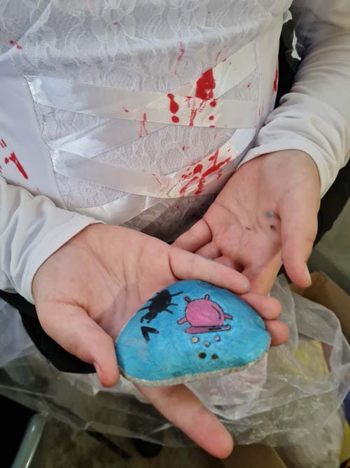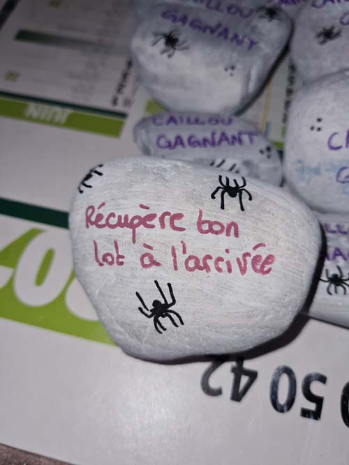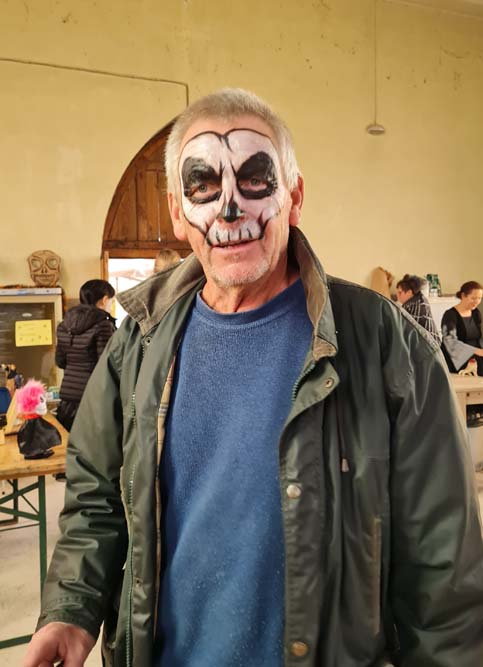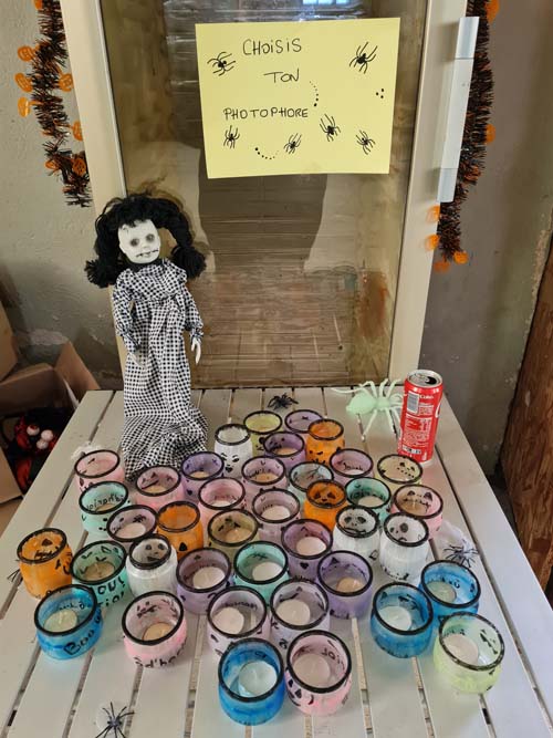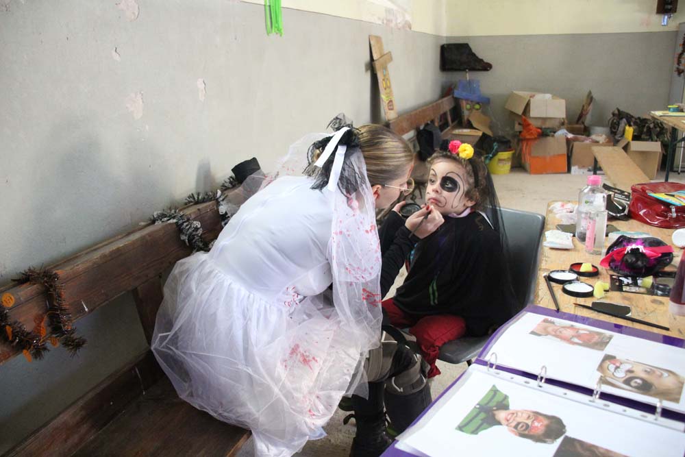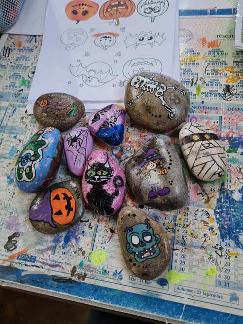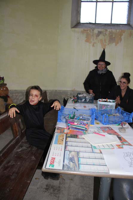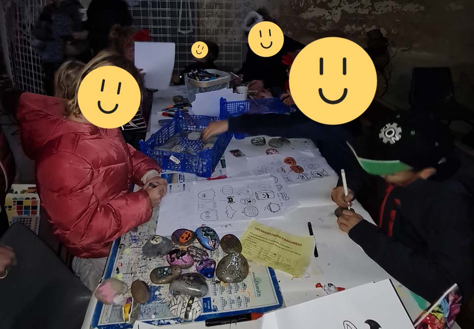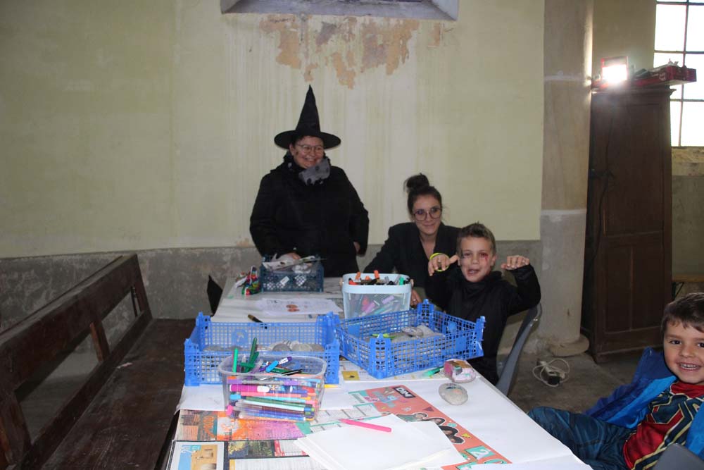 La chapelle servait d’abri, à l’intérieur Patricia initiait les petits monstres à décorer les cailloux sur le thème d’Halloween, une maquilleuse transformait les enfants sages en petits monstres grimaçants.