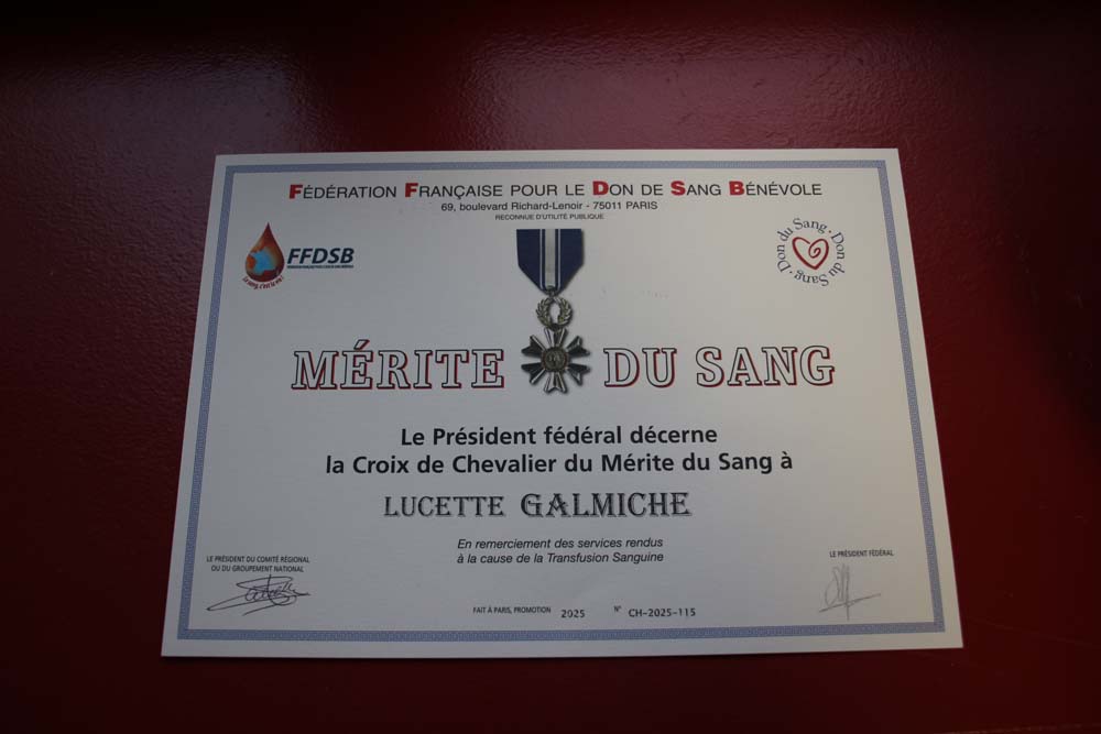 Lucette GALMICHE du Val-d’Ajol et Pierre VINCENT du Girmont- Val-d’Ajol, ont reçu la Croix de Chevalier du mérite du sang.