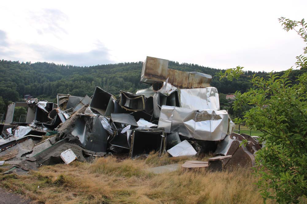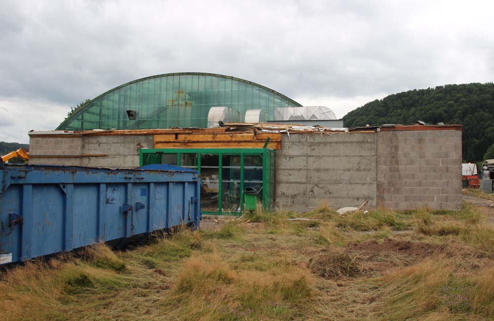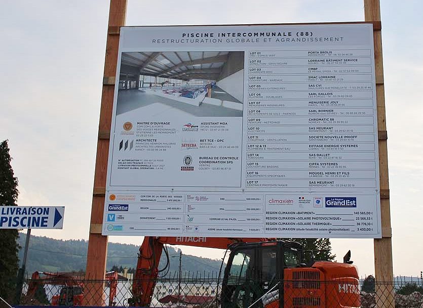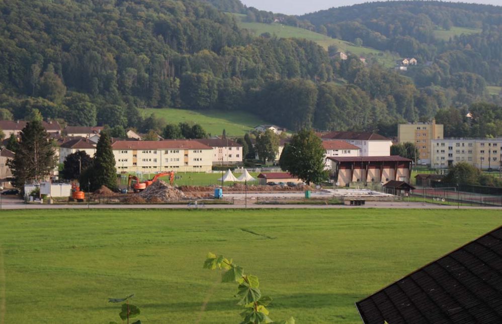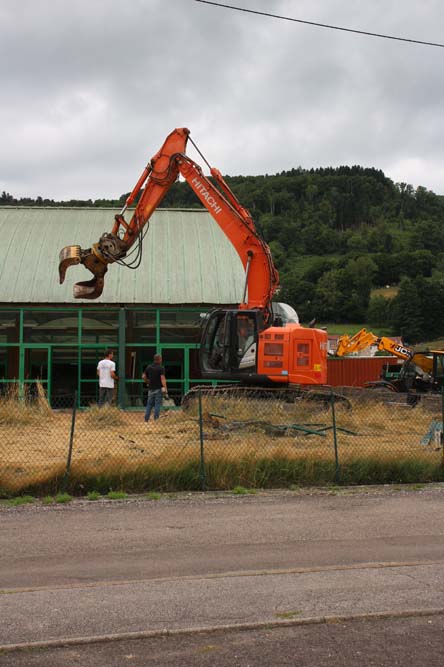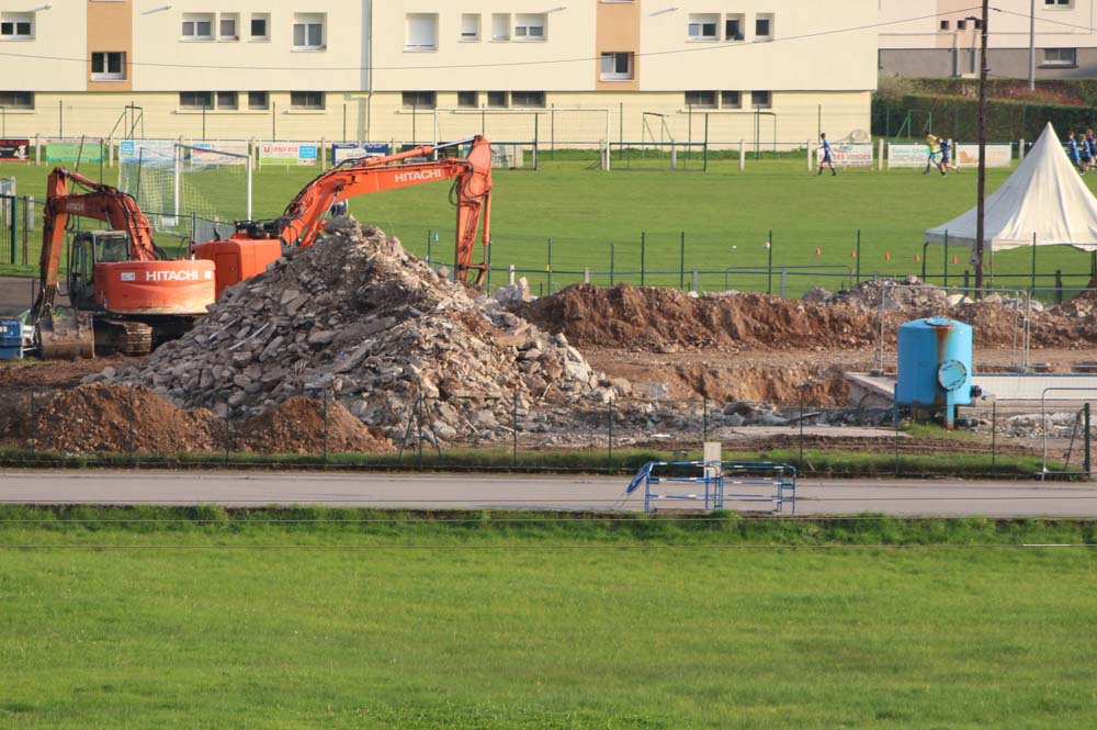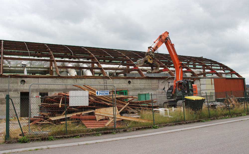 Les travaux de la piscine ont débuté en juin par la démolition des bâtiments, tous les déblais ont été triés pour être recyclés, pour le moment les pelleteuses continuent le déblaiement de blocs de béton et de terre. Seuls les bassins sont conservés.