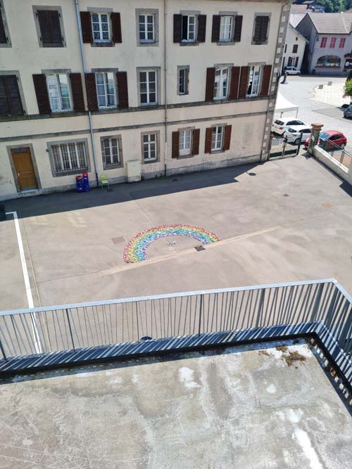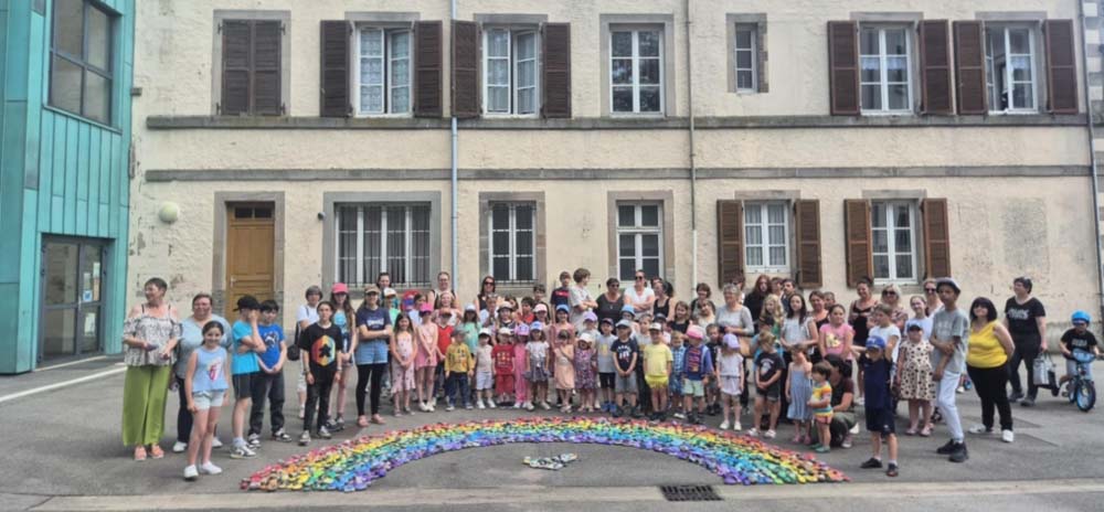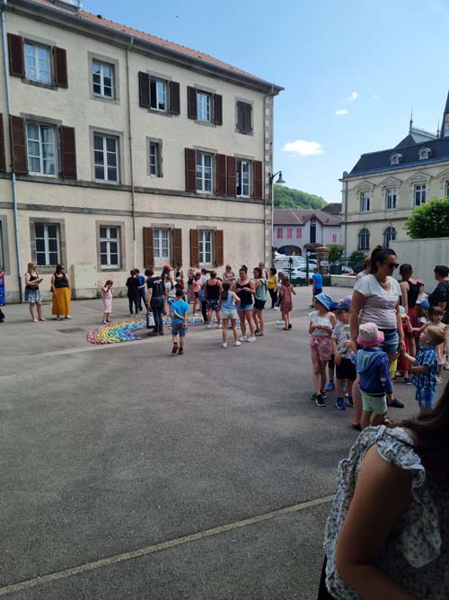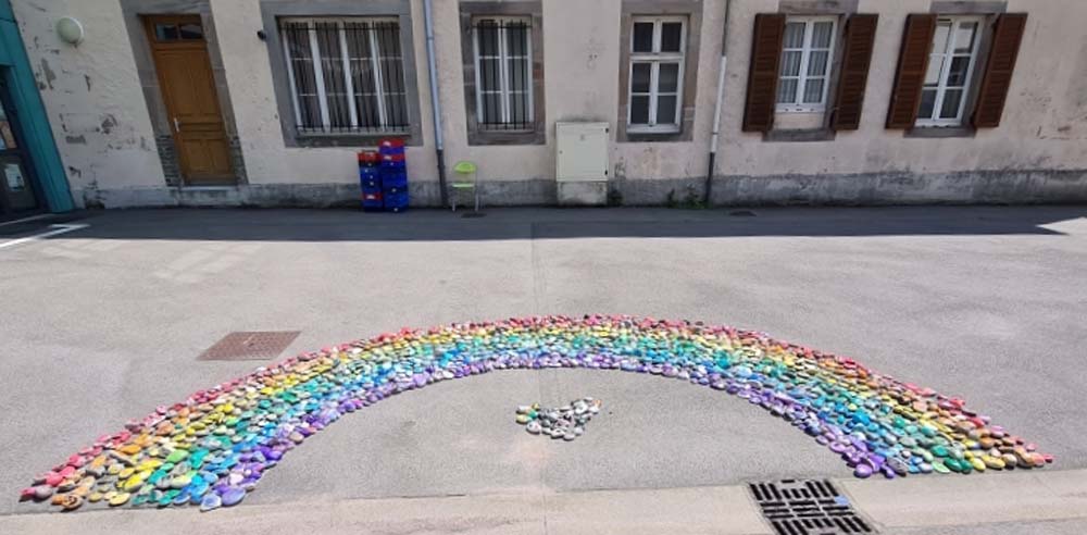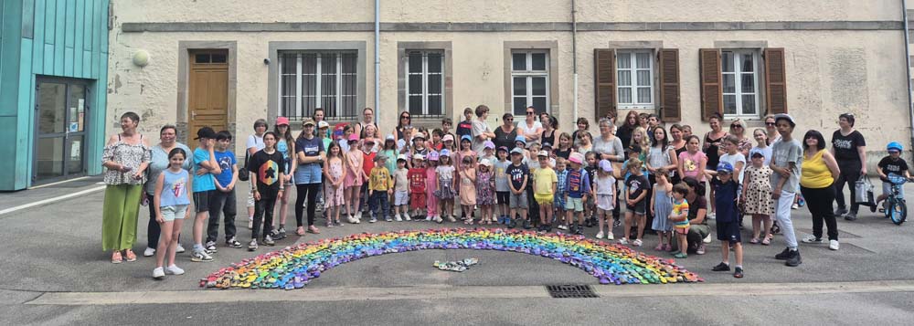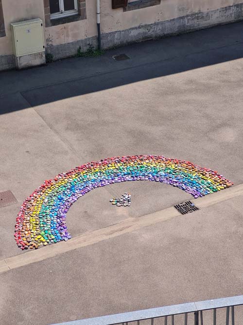!Ce samedi, la cour de l’espace Arts et Culture de Le Val d’Ajol a vu naître une œuvre exceptionnelle : un arc-en-ciel de 1368 cailloux peints à la main par les enfants (et leurs parents !) de la commune. Ce projet artistique ambitieux, intitulé « Défi Arc-en-ciel », a rassemblé un large éventail de partenaires locaux et rencontré un franc succès.