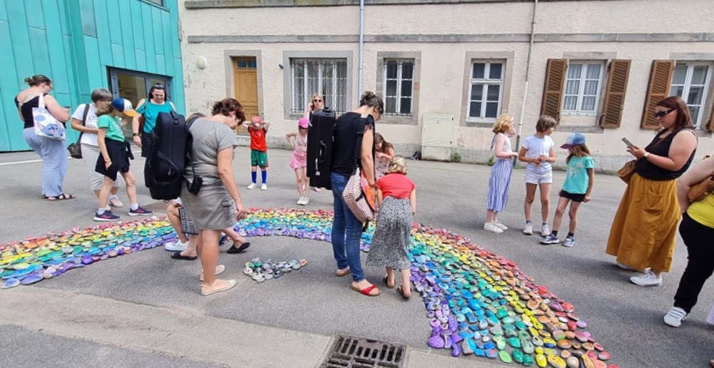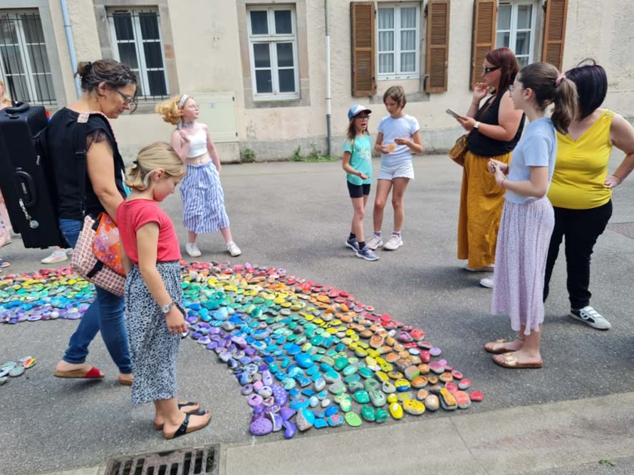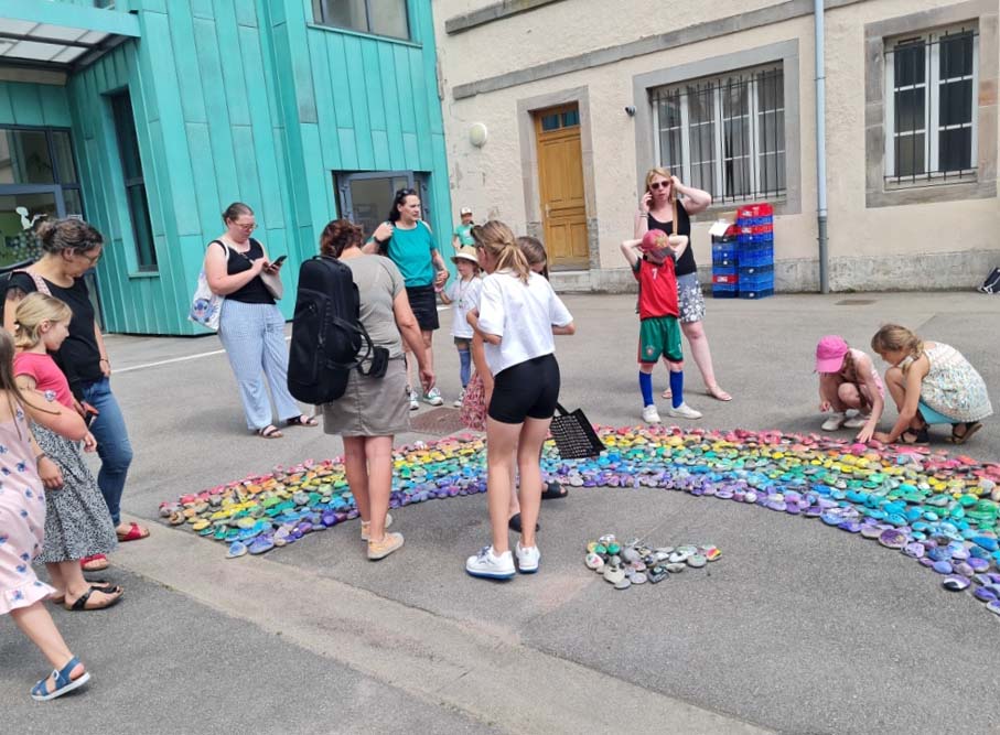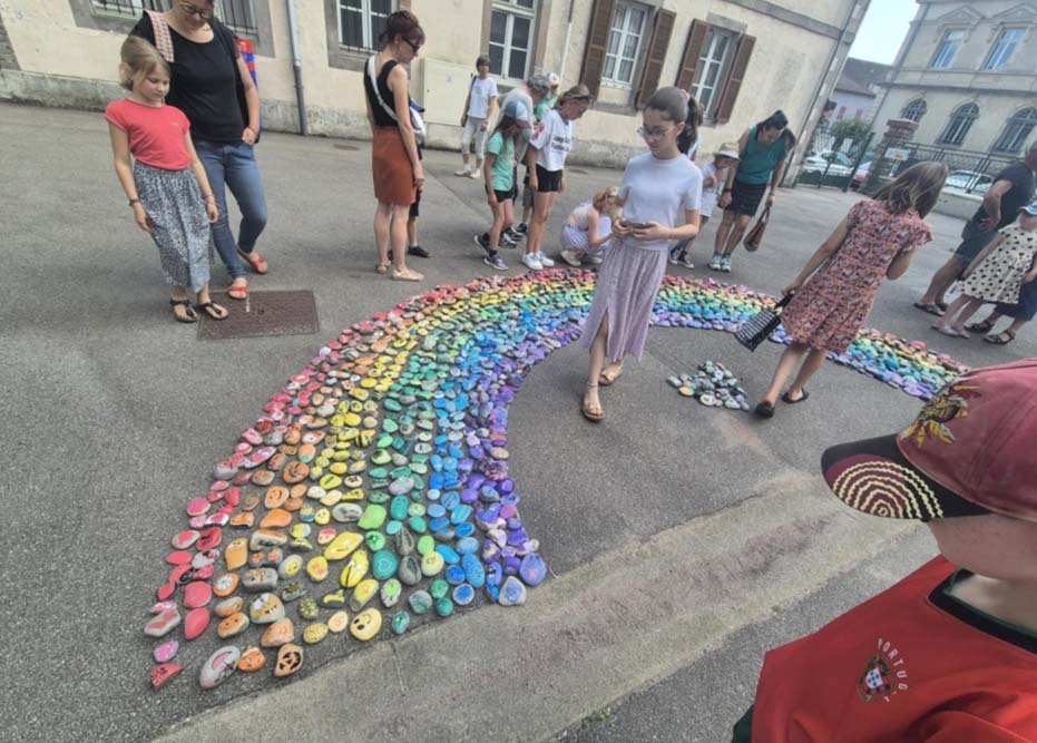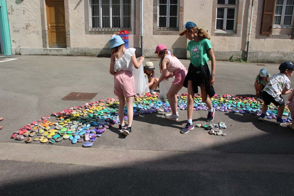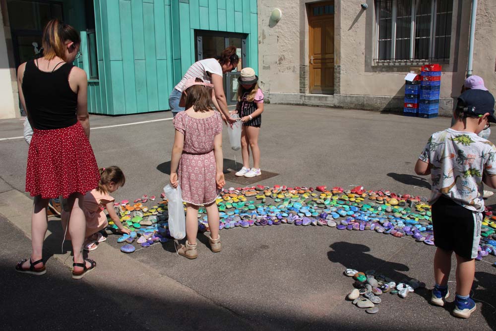Portée par la MJC du Val d’Ajol, la ludothèque Un Air de Jeux et l’association Love on the Rocks, cette initiative a su mobiliser largement : écoles, périscolaire, accueil de loisirs, club ados et habitants se sont tous prêtés au jeu avec enthousiasme. Au total, ce sont 1368 cailloux qui ont été décorés, puis rassemblés pour former un chef-d’œuvre collectif haut en couleurs.