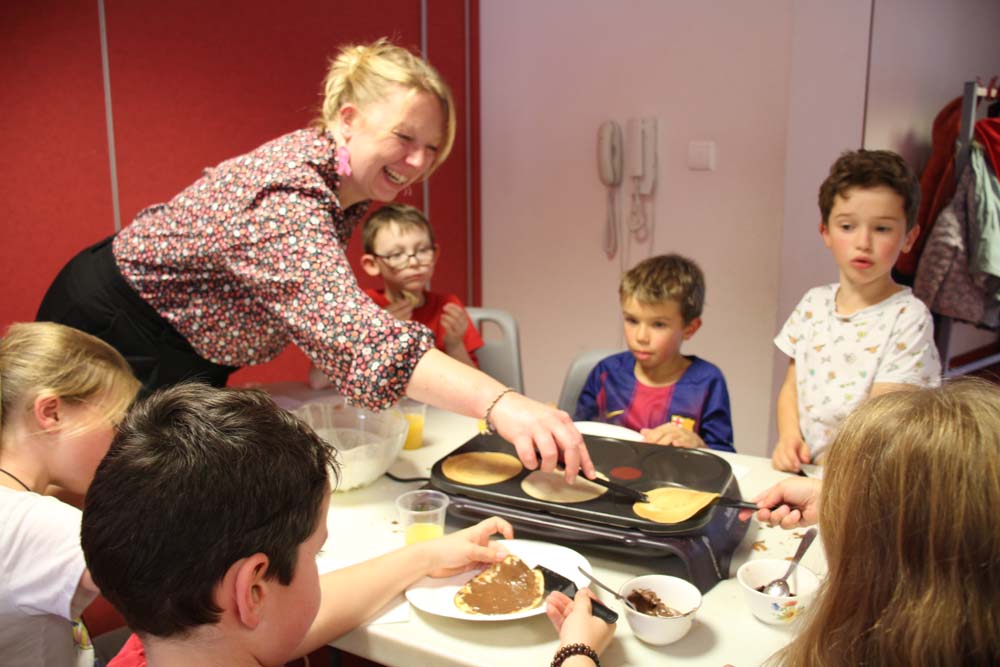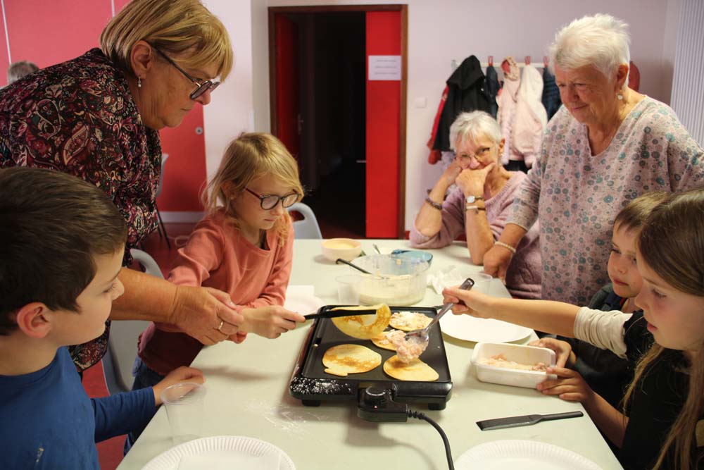 Lors de la semaine du goût, l’association reçoit les élèves d’une classe de l’école publique, pour la confection de crêpes salées et sucrées qui sont dégustées au goûter, avant de retourner en classe.
