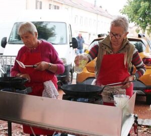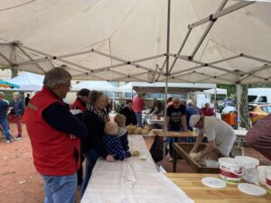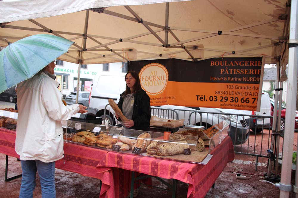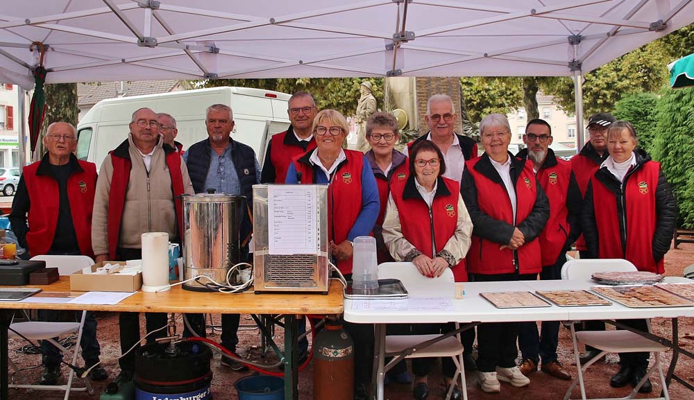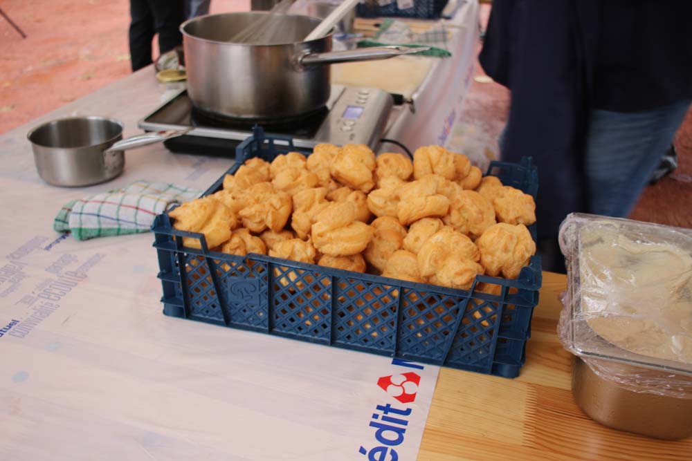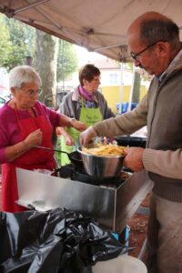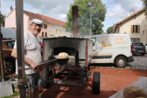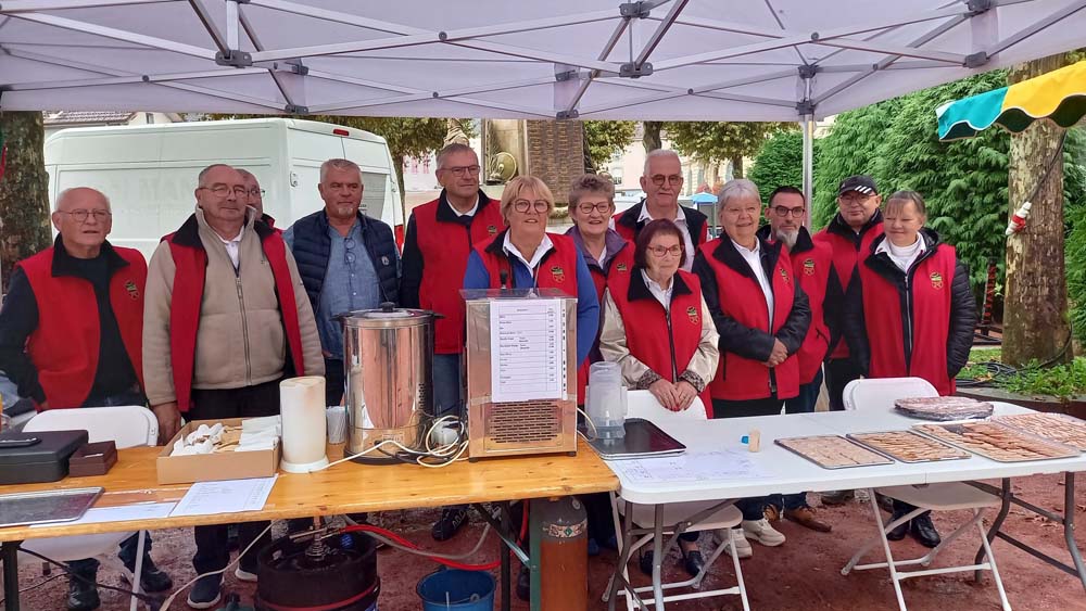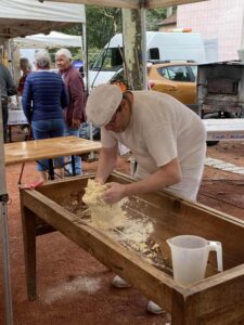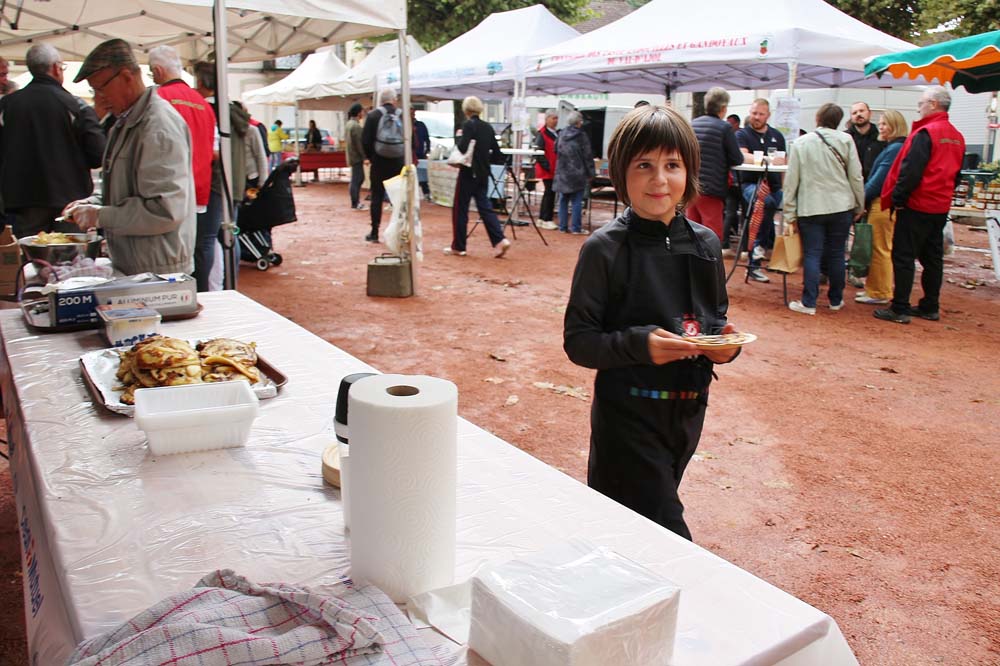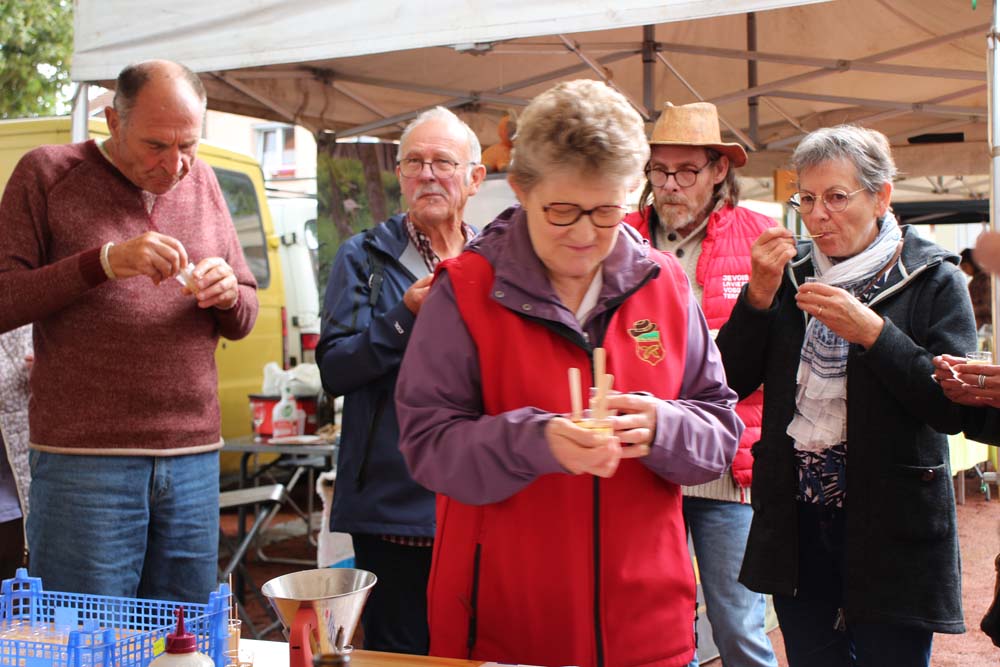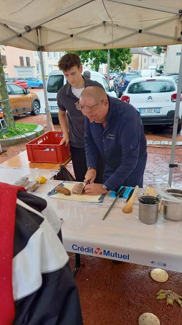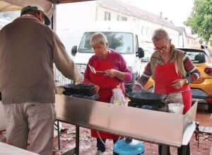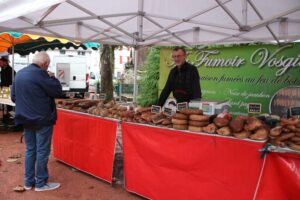 Les bénévoles de l’association des parents d’élèves tenaient le stand des Beignets aux pommes et la Confrérie gérait la buvette et la restauration. L’après-midi, le Fumoir Vosgien montrait les étapes de fabrication d’un pied de porc farci, désossage…. Et Hervé NURDIN du Fournil Ajolais pétrissait et cuisait des miches, et des pains de poires dit « Réma » dans certains villages.