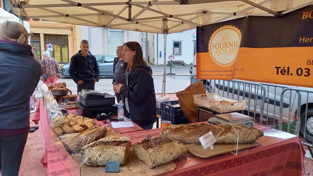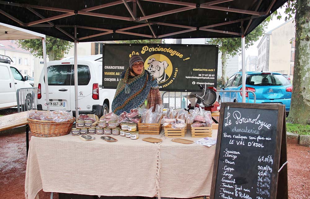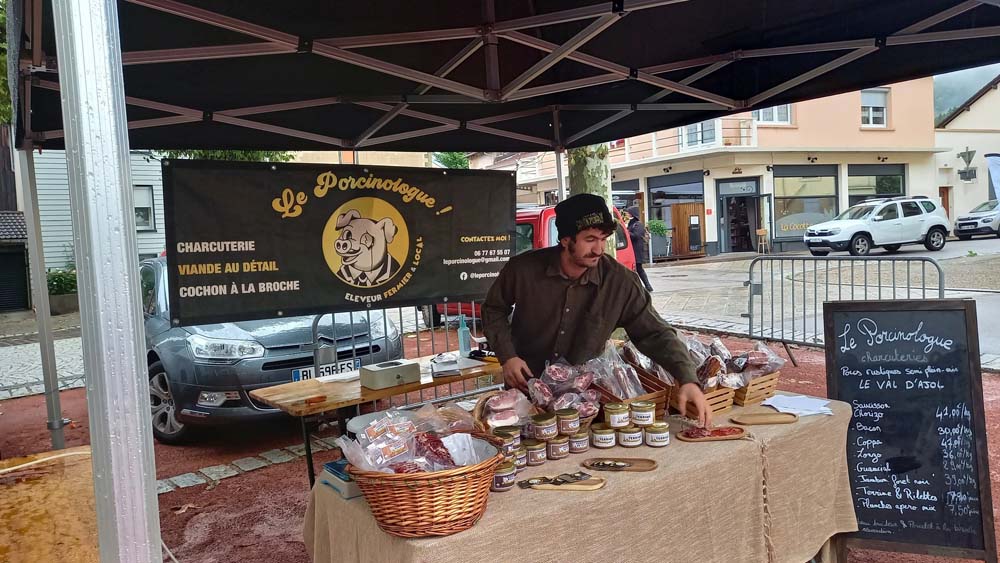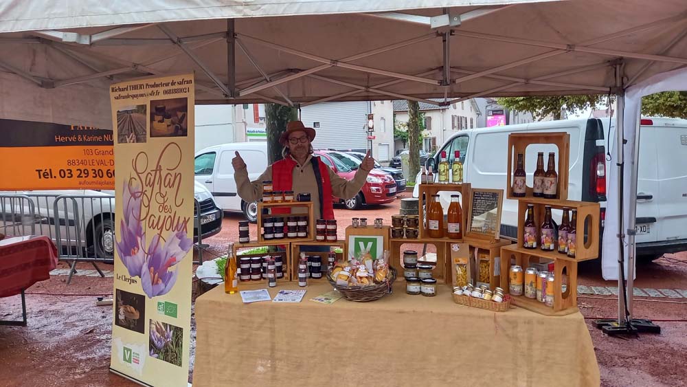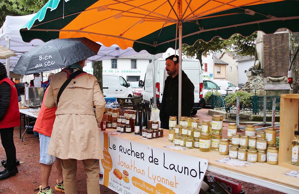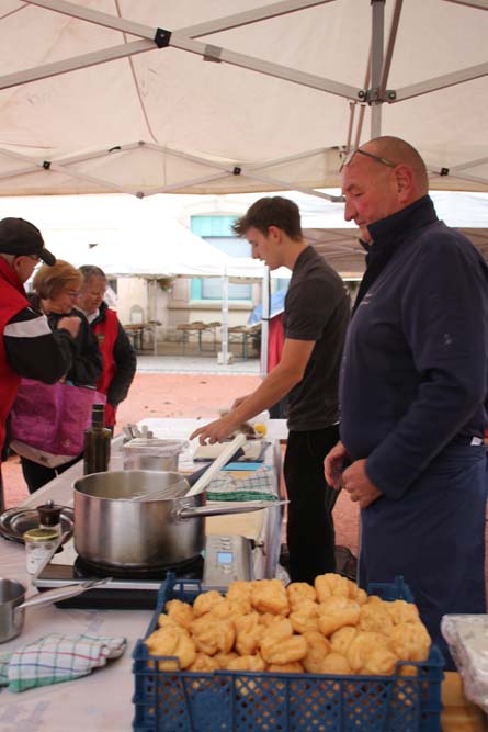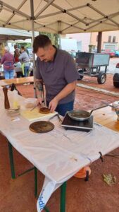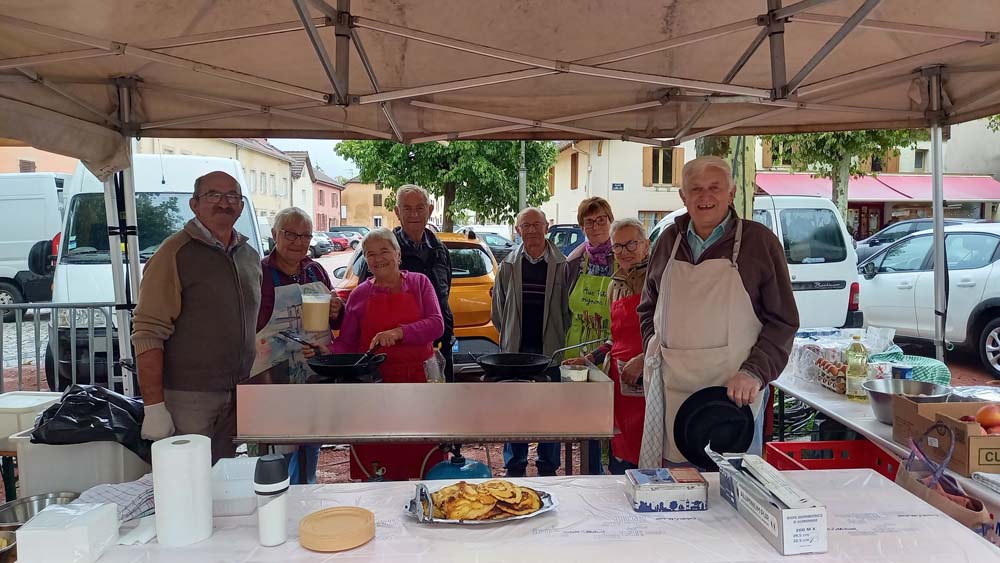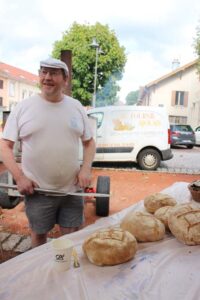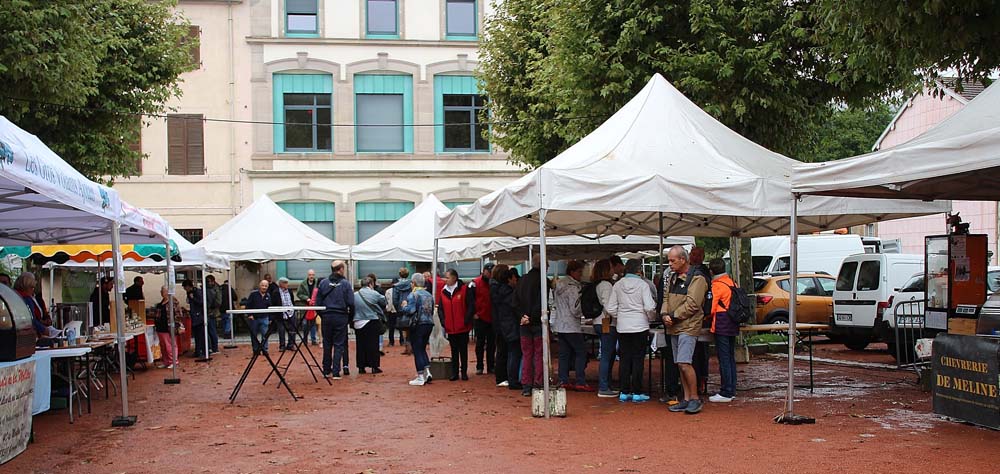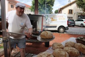 Les bénévoles de l’association des parents d’élèves tenaient le stand des Beignets aux pommes et la Confrérie gérait la buvette et la restauration. L’après-midi, le Fumoir Vosgien montrait les étapes de fabrication d’un pied de porc farci, désossage…. Et Hervé NURDIN du Fournil Ajolais pétrissait et cuisait des miches, et des pains de poires dit « Réma » dans certains villages.